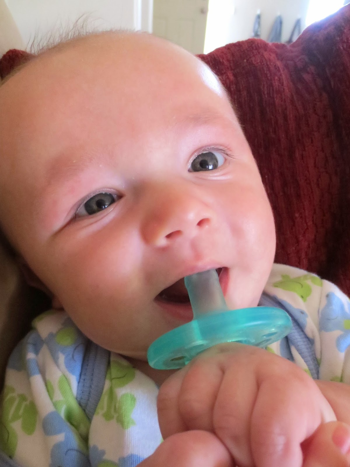 Jacob is emotional. He can go from smiling to crying and then back to smiling in a matter of seconds. He eats about 6oz every feeding and sleeps from 8pm to 6am. He likes his pacifier and can actually keep it in his mouth. His neck is still pretty stiff from having so little room in my stomach. So he'll only turn his head to the left which has caused a major flat spot on his head. He doesn't roll over or anything. He doesn't really move at all actually. He's discovered his hands and sucks on them once in a while.